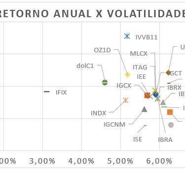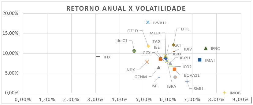 Ao compararmos o IFIX com todos os demais índices, fica evidente que, no quesito volatilidade, ele supera todos, apresentando a menor oscilação entre as opções analisadas.