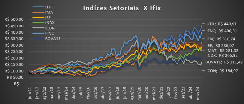 Já na comparação com os Índices Setoriais, o IFIX também apresentou um desempenho sólido. Ele ficou em terceiro lugar, superado apenas pelo UTIL (Índice de Energia Elétrica) e pelo IFNC (Índice Financeiro). Seu retorno ficou muito acima do ICON (Índice de Consumo), reforçando seu posicionamento como uma alternativa competitiva dentro do mercado de renda variável.